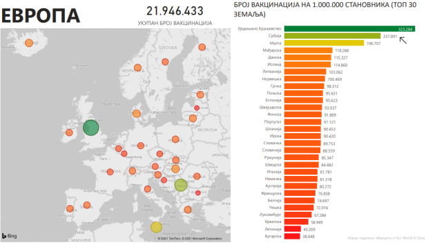 Prema broju vakcinacija na milion stanovnika, Srbija je druga u Evropi, posle Velike Britanije, a prema broju građana koji su primili obe doze vakcine na milion stanovnika prva je u Evropi. Posle Srbije su Malta i Island.