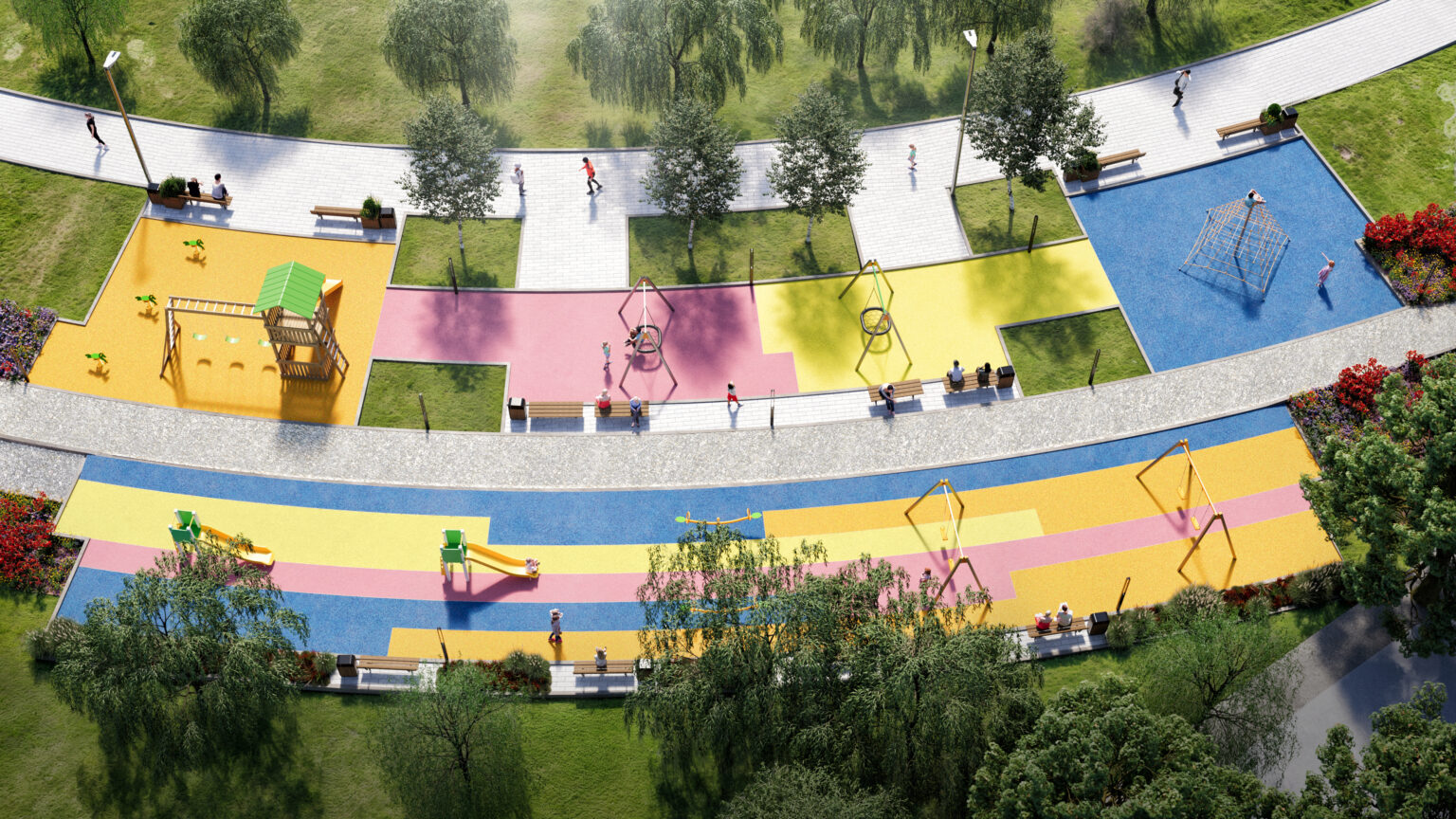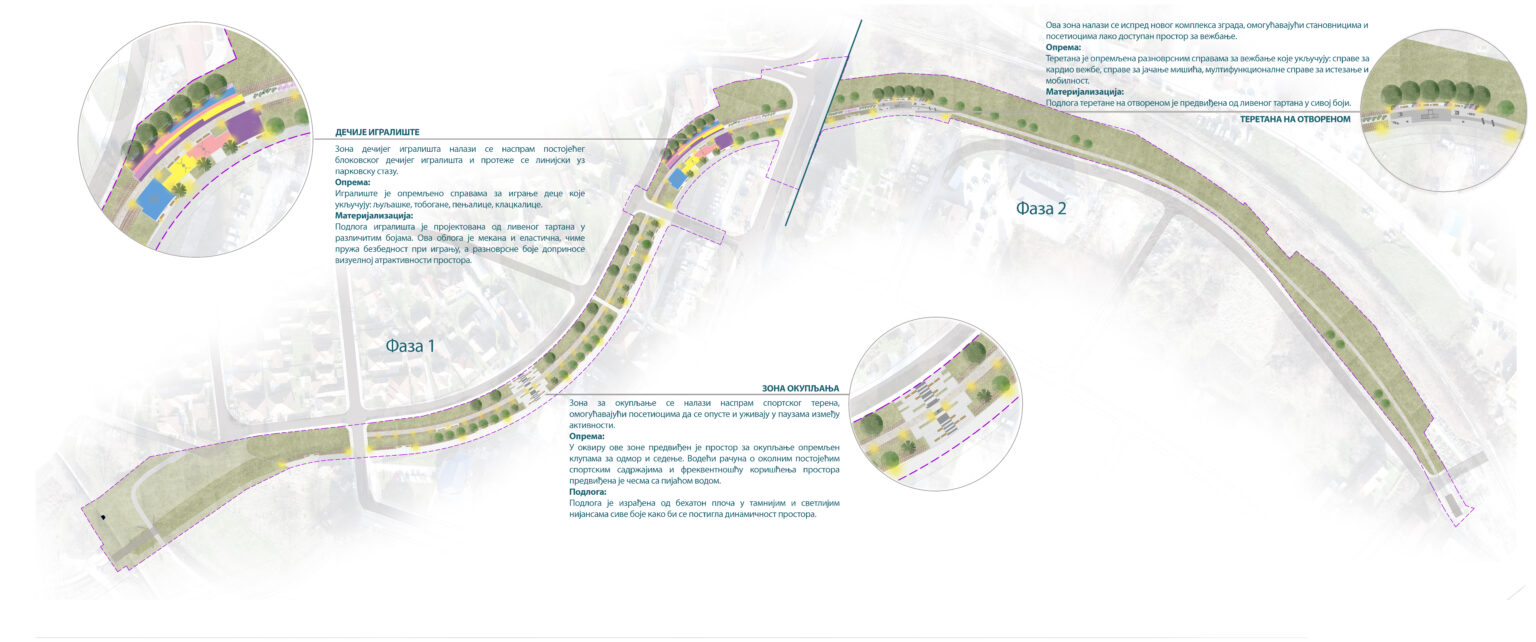 Centralni deo budućeg parka činiće uređena pešačka staza, uz koju će biti formirane zone za okupljanje i dečju igru. Planirano je postavljanje savremenog mobilijara, klupa, rasvete, kao i sadržaja namenjenih najmlađima, poput igrališta sa različitim spravama i bezbednom podlogom.